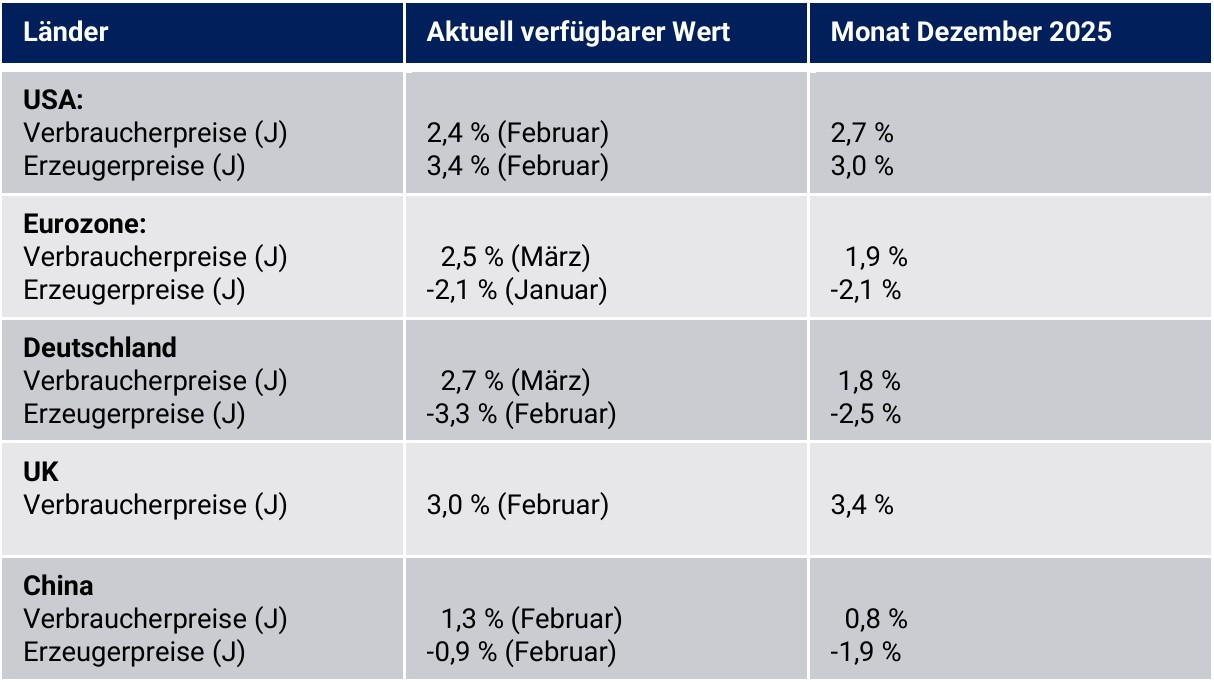 Das Bild bei Verbraucherpreisen ist unvollständig, da überwiegend Daten für März nicht verfügbar sind. Im März ergab sich bedingt durch Energiepreisanstiege eine grundsätzlich verschärfte Inflationslage. In der Eurozone kam es bei den Verbraucherpreisen seit Dezember 2025 ausgehend von 1,9 % zu einem Anstieg auf 2,5 % per März 2026 (vorläufiger Wert). In den USA ergab sich ein Rückgang von 2,7 % auf 2,4 % per Februar 2026 und in Großbritannien eine Reduktion von 3,2 % auf 3,0 % per Februar 2026. In Japan gaben die Verbraucherpreise im Zeitfenster Dezember bis Februar von 2,1 % auf 1,3 % nach. Im 1. Quartal 2026 stellte sich bei den Verbraucherpreisen in China im Verlauf ausgehend von 0,8 % im Dezember ein Anstieg auf 1,3 % per Februar 2026 ein. In Indien, das grundsätzlich von höheren Inflationsraten geprägt ist, kam es zu einem Plus der Verbraucherpreise von 1,33 % per Dezember auf 3,21 % per Februar 2026.
